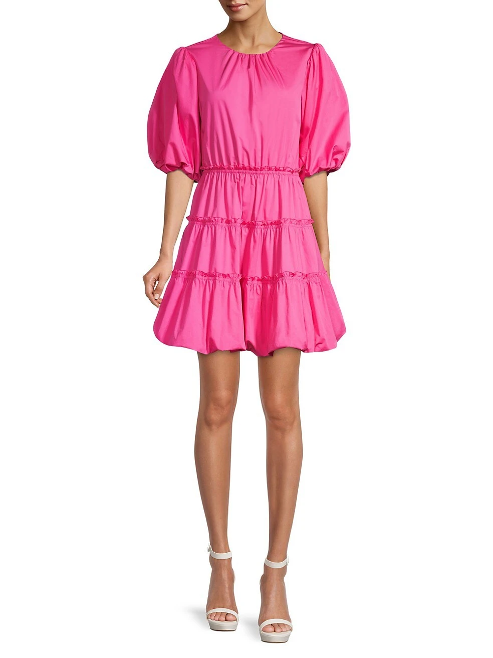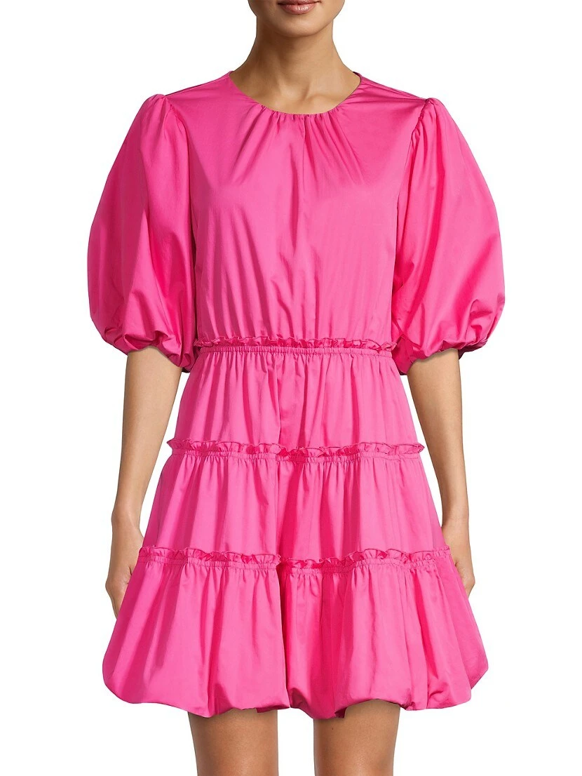 Crafted of cotton poplin, Jason Wu’s tiered minidress features a crewneck, voluminous balloon sleeves, and a flared skirt trimmed with delicate ruffles.