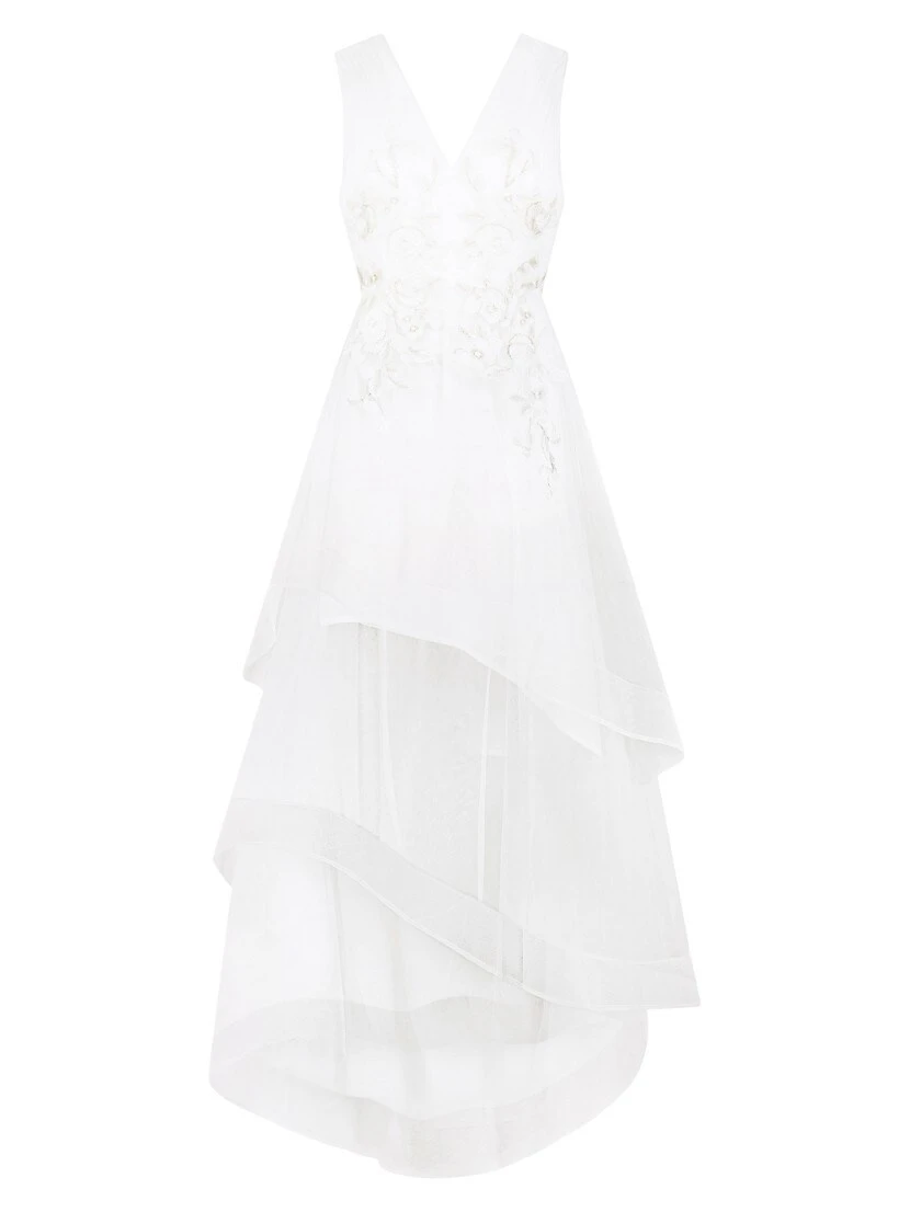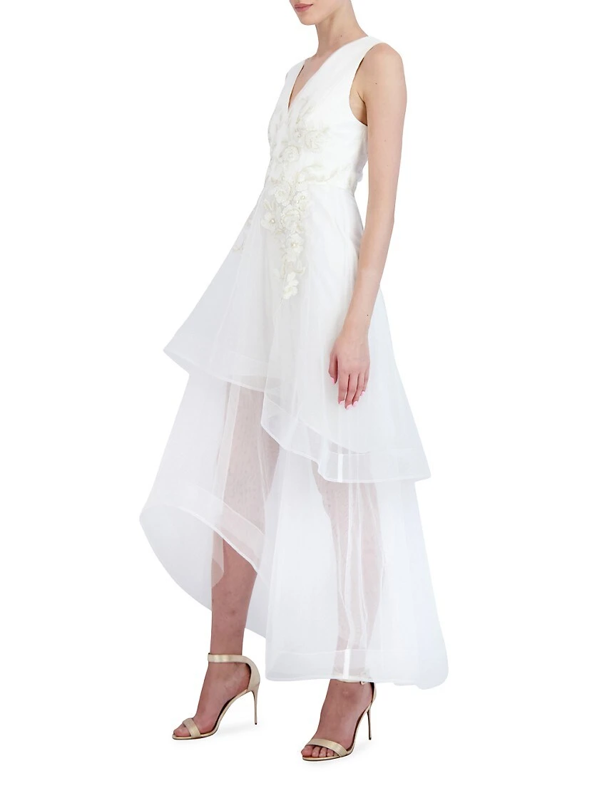 BCBGMAXAZRIA creates high-fashion pieces evoking classic European sophistication with an American twist. Featuring stunning floral embroidery, this gown is finished with an asymmetric skirt.