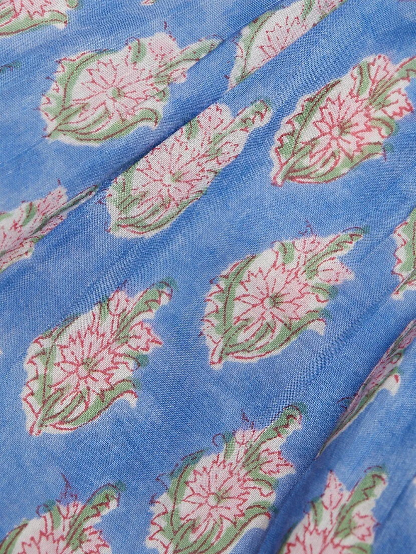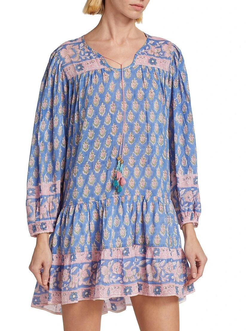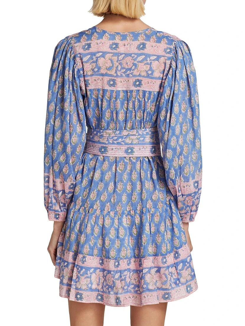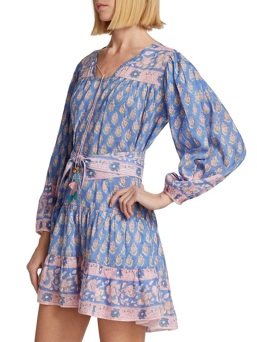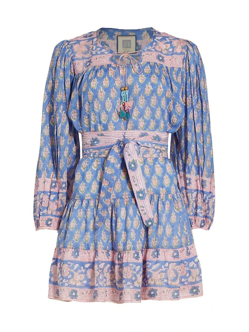 Bell’s Adele minidress flaunts a dropped waist with a flounce hem, showcasing a folkloric floral print on a soft cotton-silk blend. Notched at the neck, this versatile style can be worn beltless for a shift silhouette or cinched.