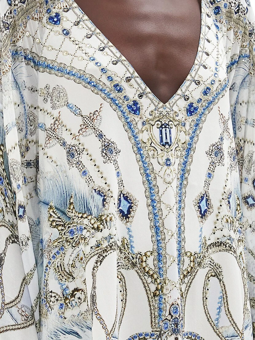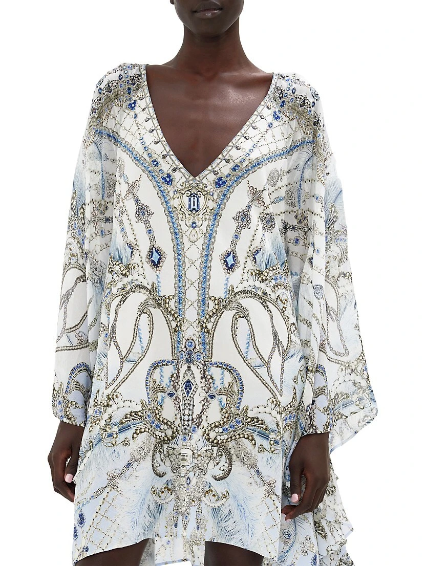 From the Moon and Back Collection. Cut in an asymmetric silhouette, CAMILLA’s silk long-sleeve caftan features mixed chain and feather prints.
