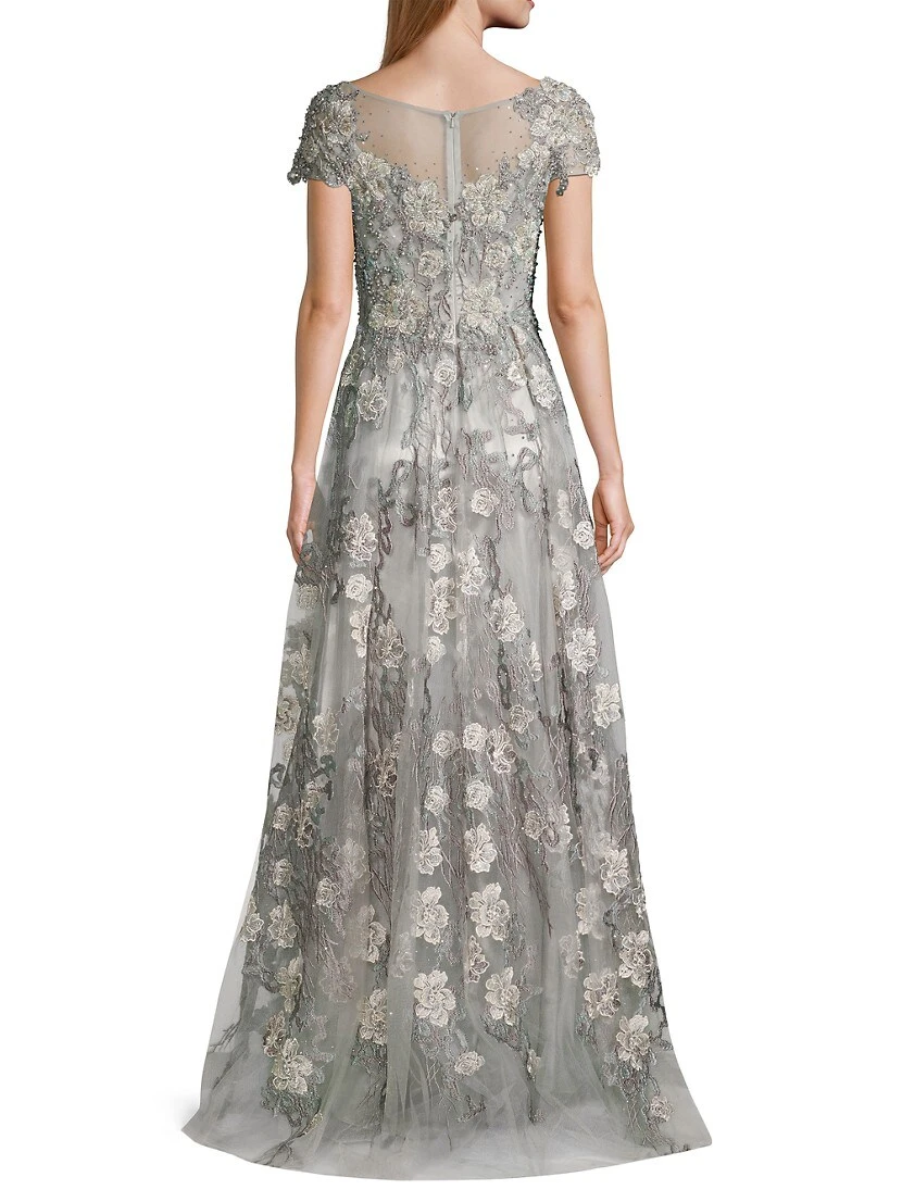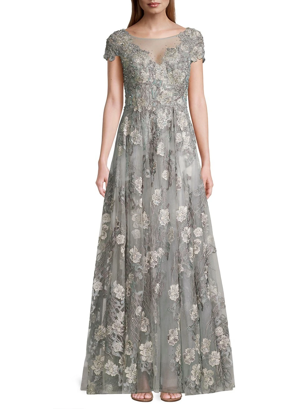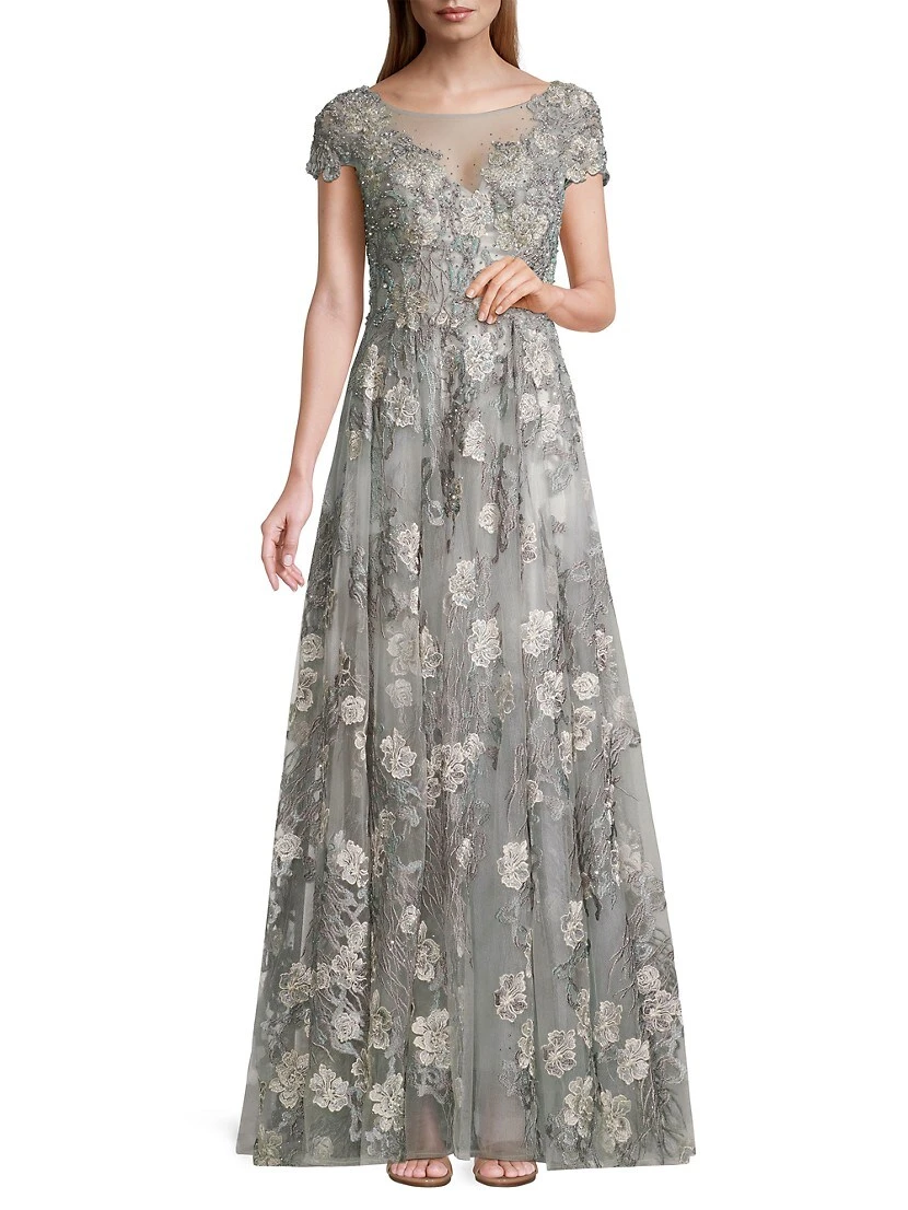 Romantic A-line gown adorned with floral embroidery that cascades down skirt, showcasing an illusion bateau neckline and cap-sleeve.