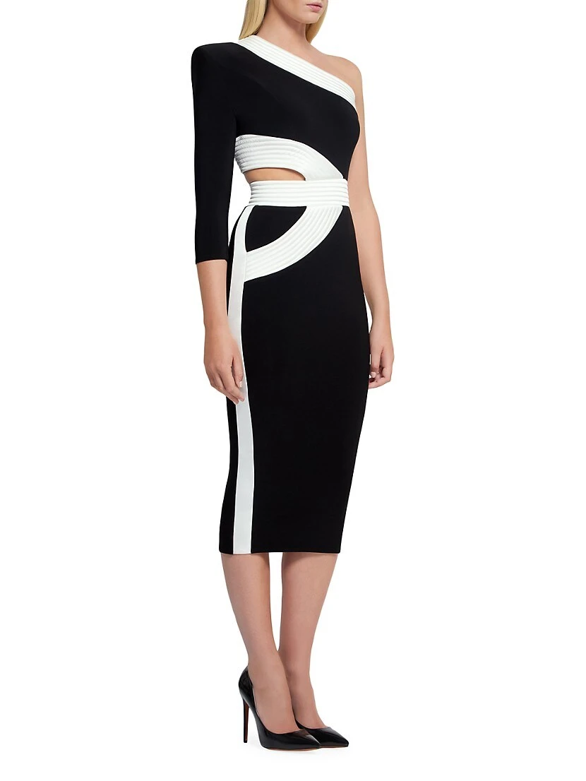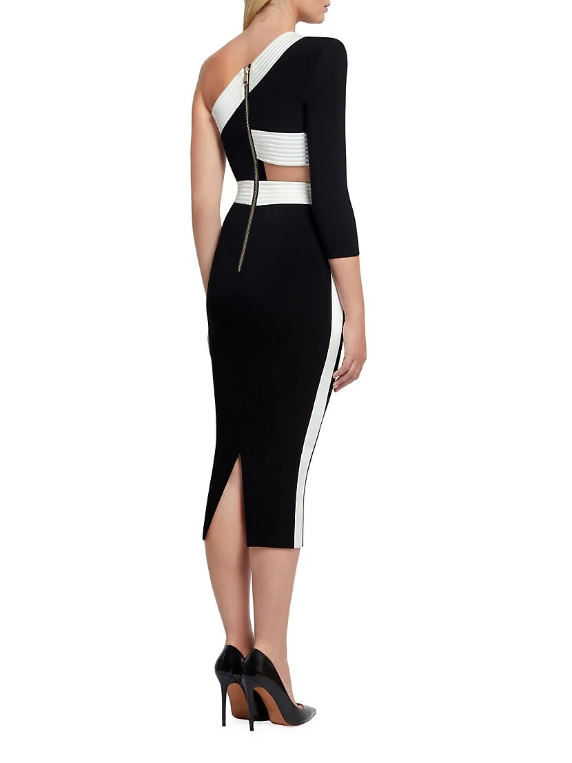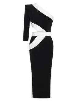 The Circus Delerium midi-dress from ZHIVAGO features a one-shoulder silhouette accented with contrast stitched satin paneling. A side cut-out and one three-quarter-length sleeve complete the look.