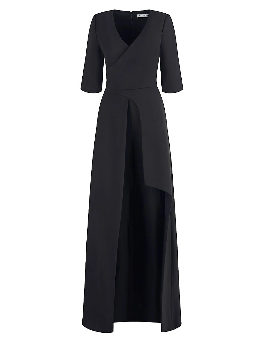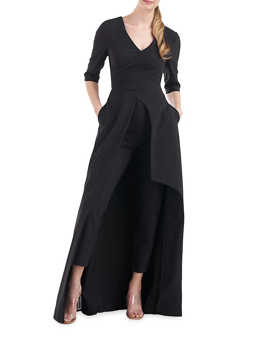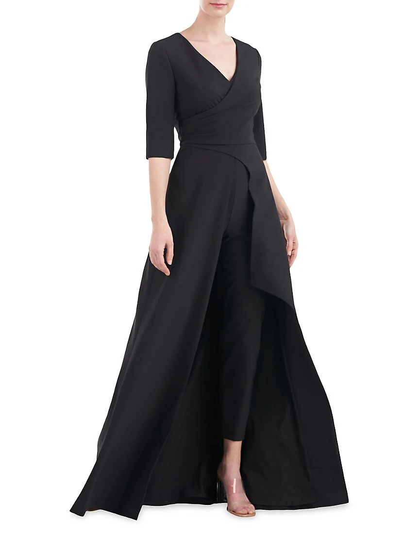 Crafted of stretch-crepe, the Gina gown by Kay Unger is designed in a walk-through style with tailored pant legs layered underneath a floor-length skirt.