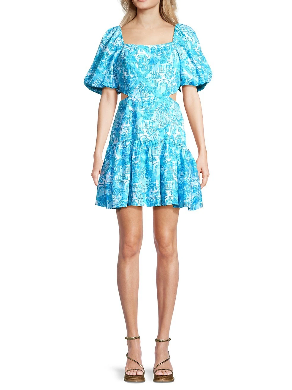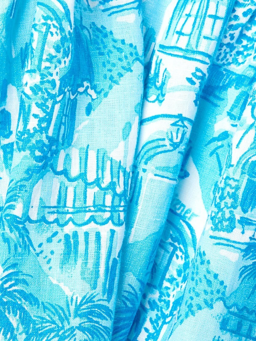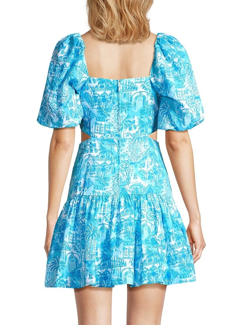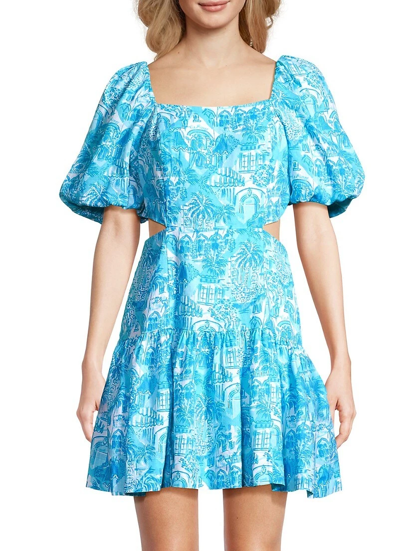 Lilly Pulitzer’s Kylanne minidress is crafted of linen and features voluminous puff sleeves. Side cut-outs and a drop-waist flared hem complete this palm-printed look.