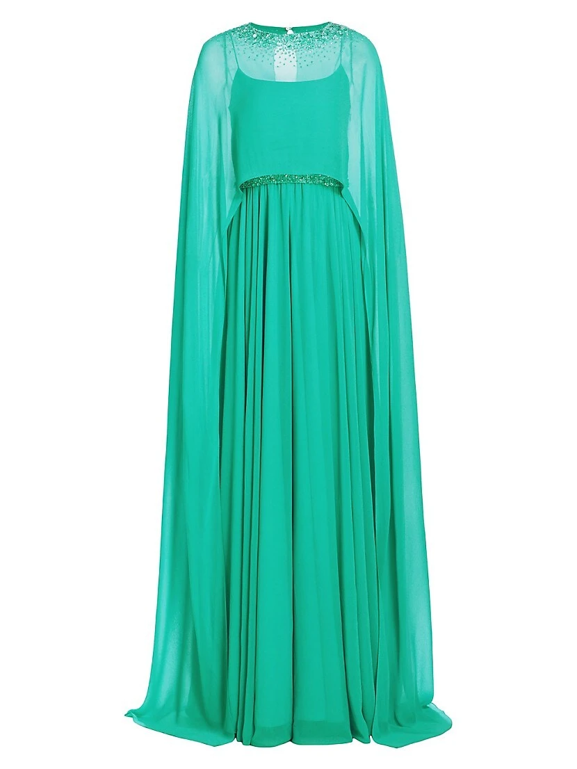 Draping elegantly with a fairytale-like cape, Sachin & Babi’s Lavinia ballgown highlights the waist with embellishments.