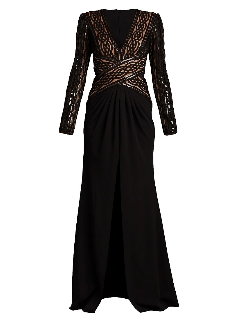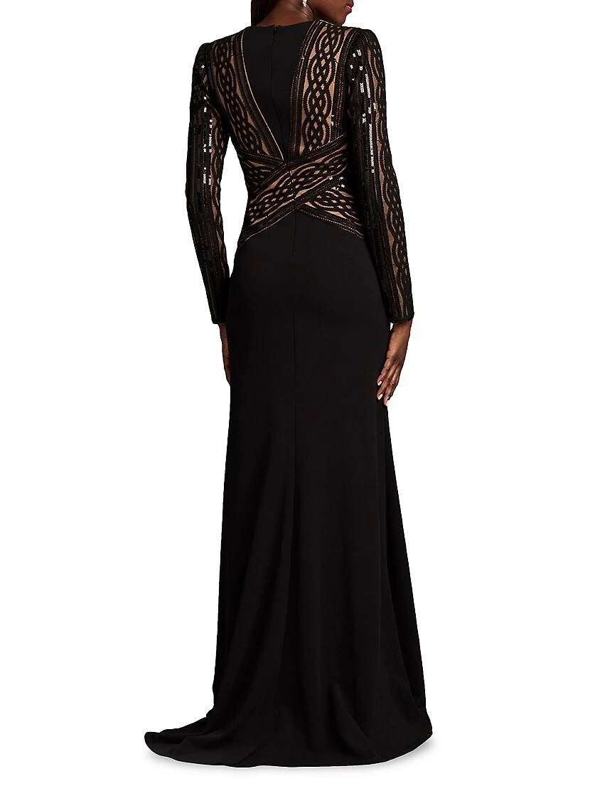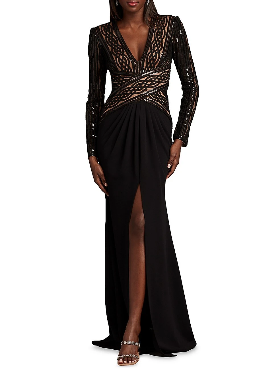 Tadashi Shoji’s long-sleeve gown boasts a crisscross pattern at the bodice with lustrous sequin detailing. Complete with an elegant trailing hem, the pleated style offers a thigh-high front slit.