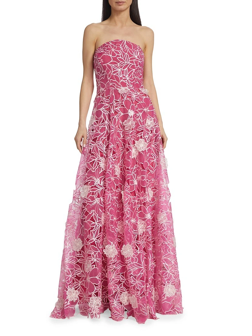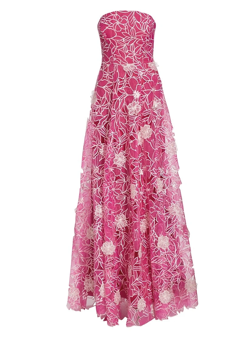 Crafted of organza, this embroidered gown from Marchesa Notte is designed in a fit-and-flare silhouette with a curved strapless neckline.