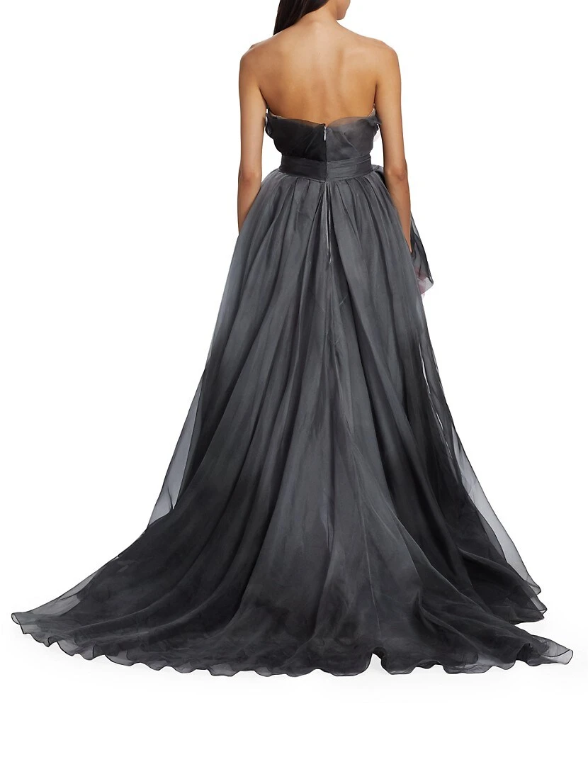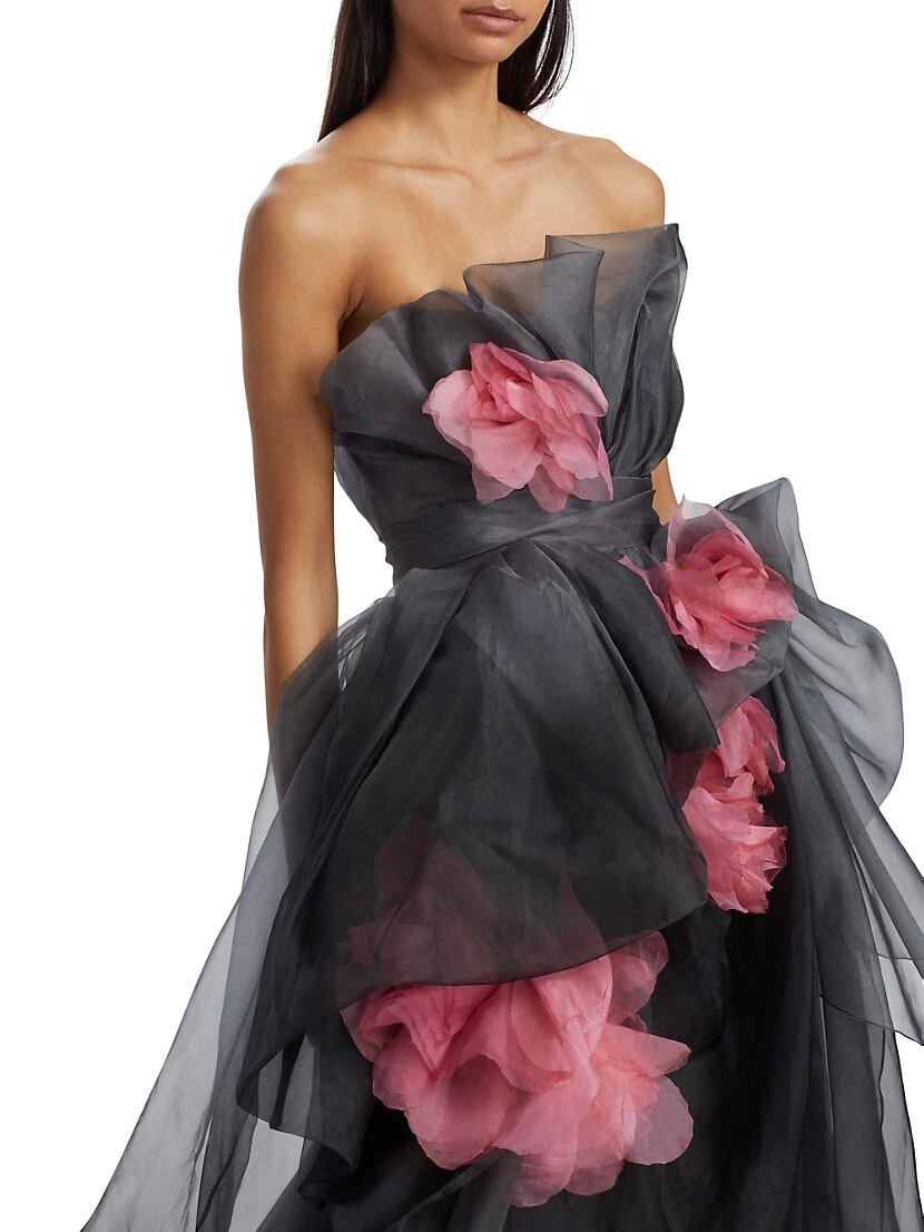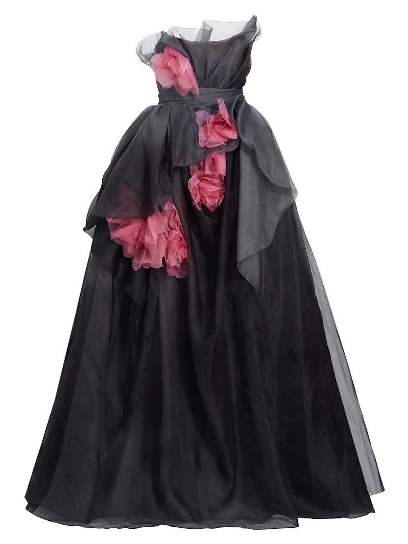 Cut in a flared silhouette, Marchesa’s strapless tulle gown offers layered styling and contrast three-dimensional floral appliqués. The sleeveless style is complete with a banded waist and an elegant trailing hem.