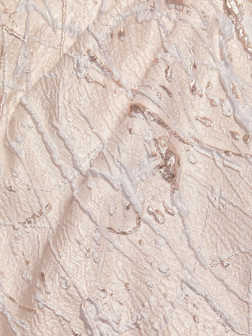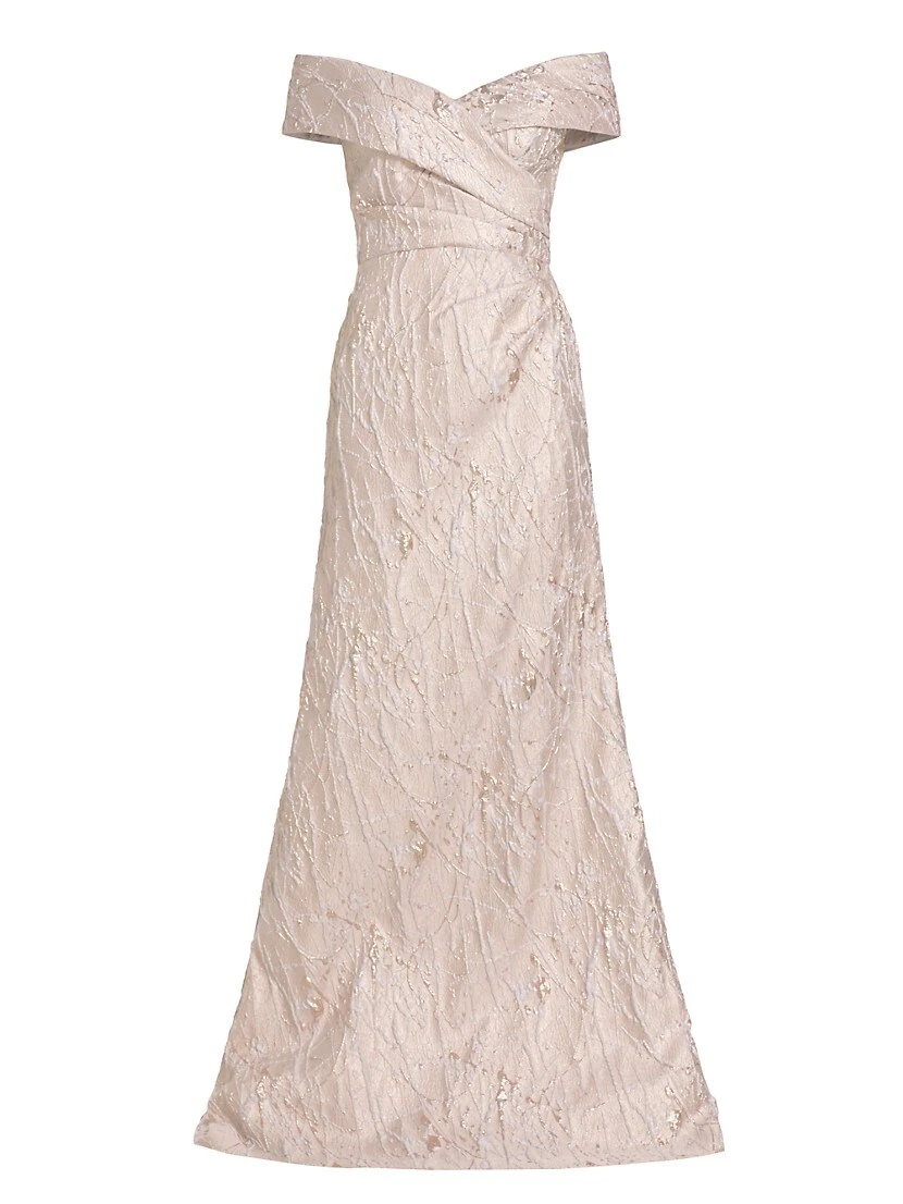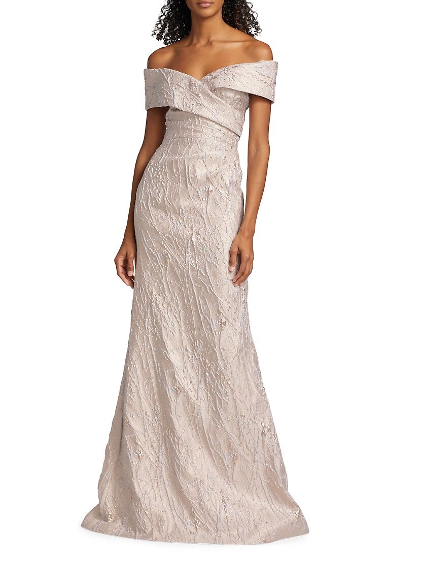 Teri Jon by Rickie Freeman’s breathtaking gown is crafted of metallic jacquard. This elegant style boasts an off-the-shoulder neck.