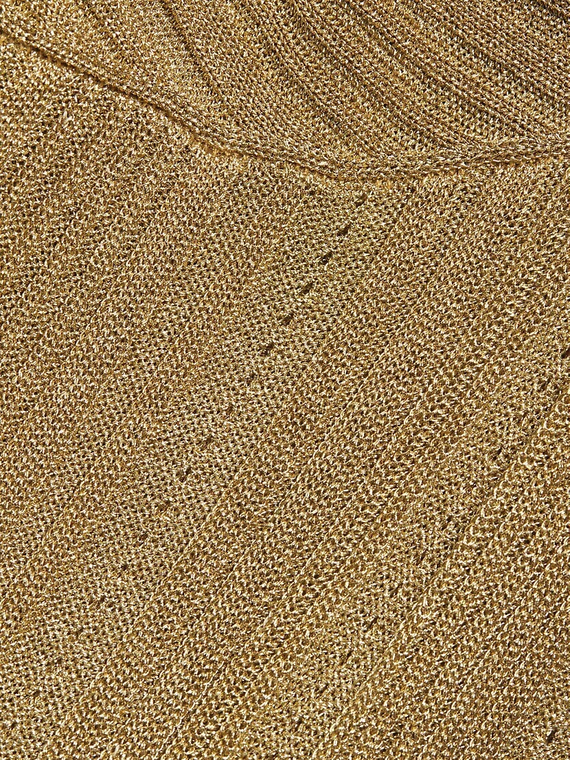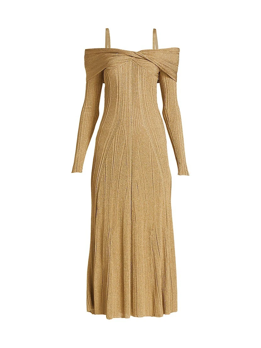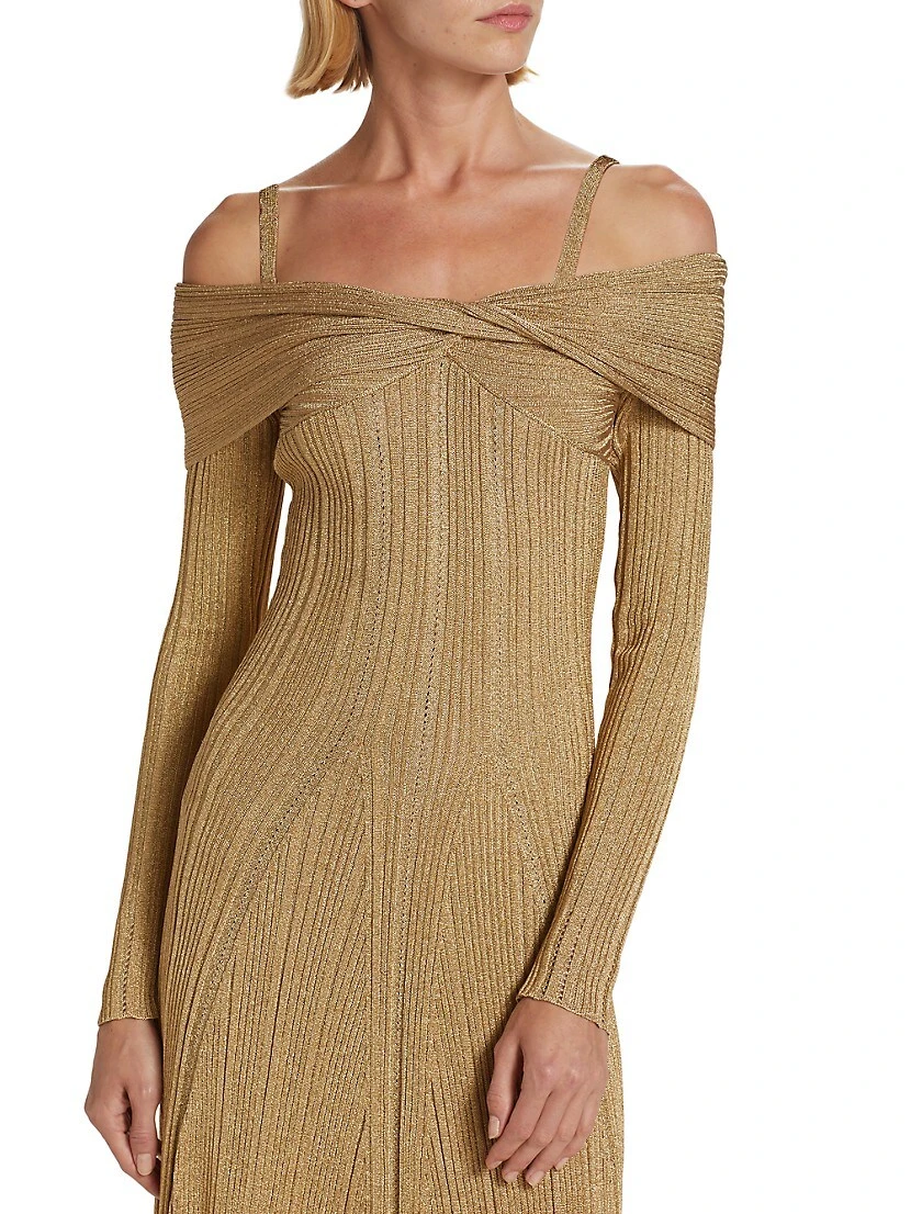 This chic Jason Wu Collection dress shimmers with metallic weaving in the rib-knit. Wrapped at the off-the-shoulder neck, this sleek design features a classic A-line silhouette.