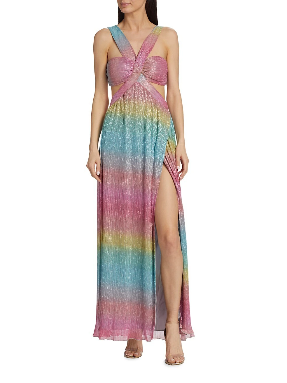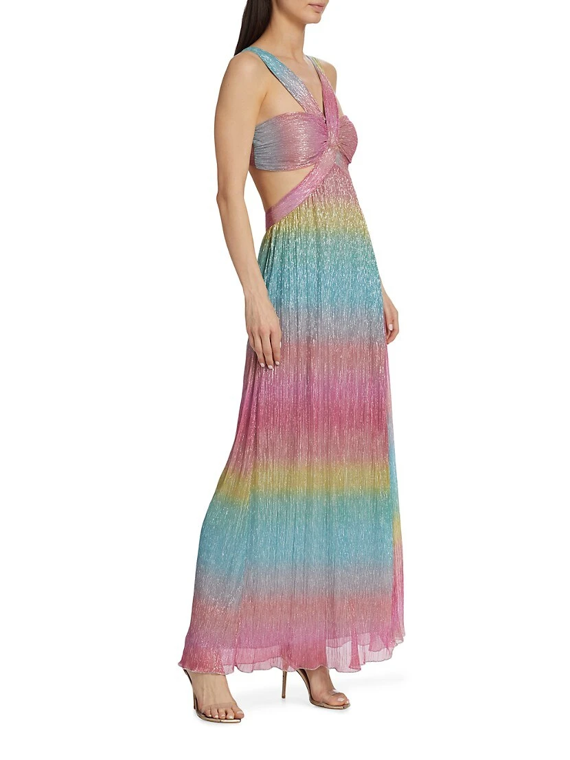 Saylor’s sleeveless open-back gown is defined by sleek side cut-outs and a metallic rainbow outer.