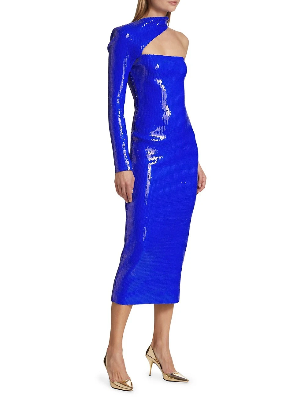 David Koma’s midi-dress flaunts sparkling sequins and an asymmetric cut-out neck. This piece is finished with a fitted skirt and single long sleeve.