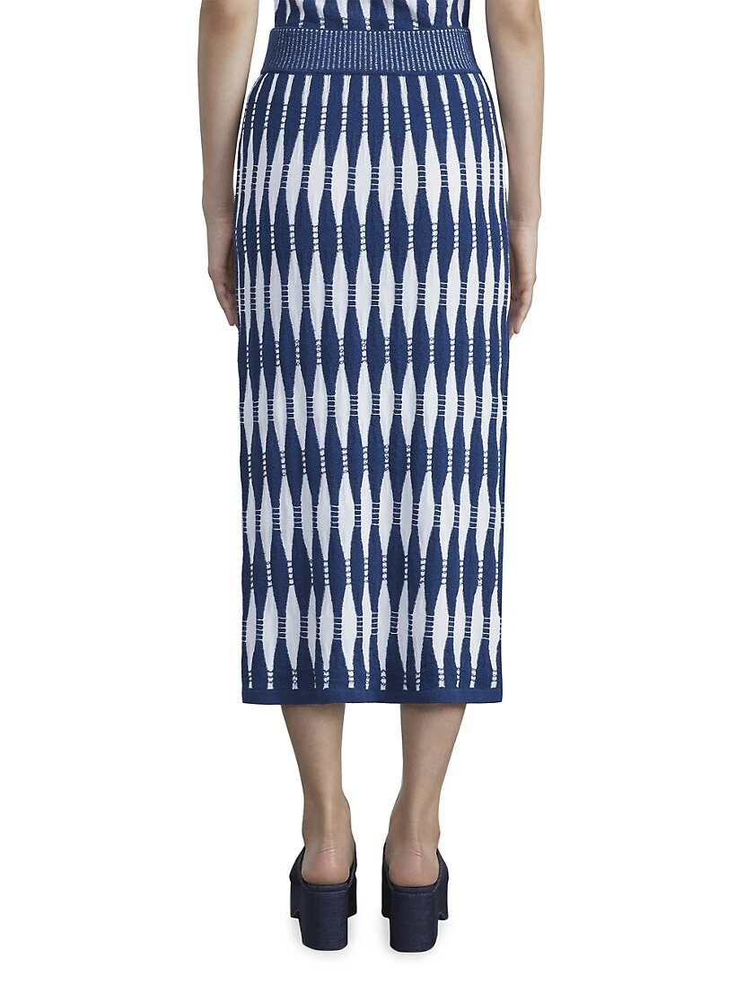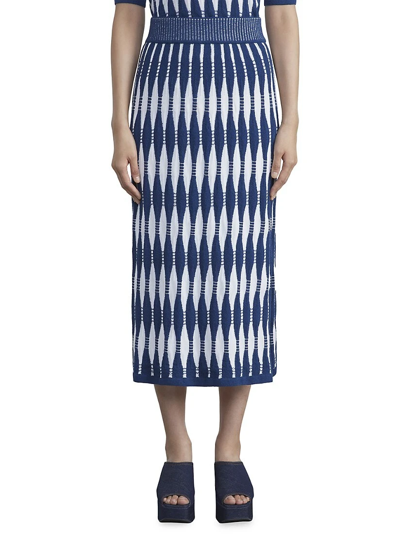 Lafayette 148 New York’s knit midi-skirt offers Shibori-inspired styling and sleek split sides.