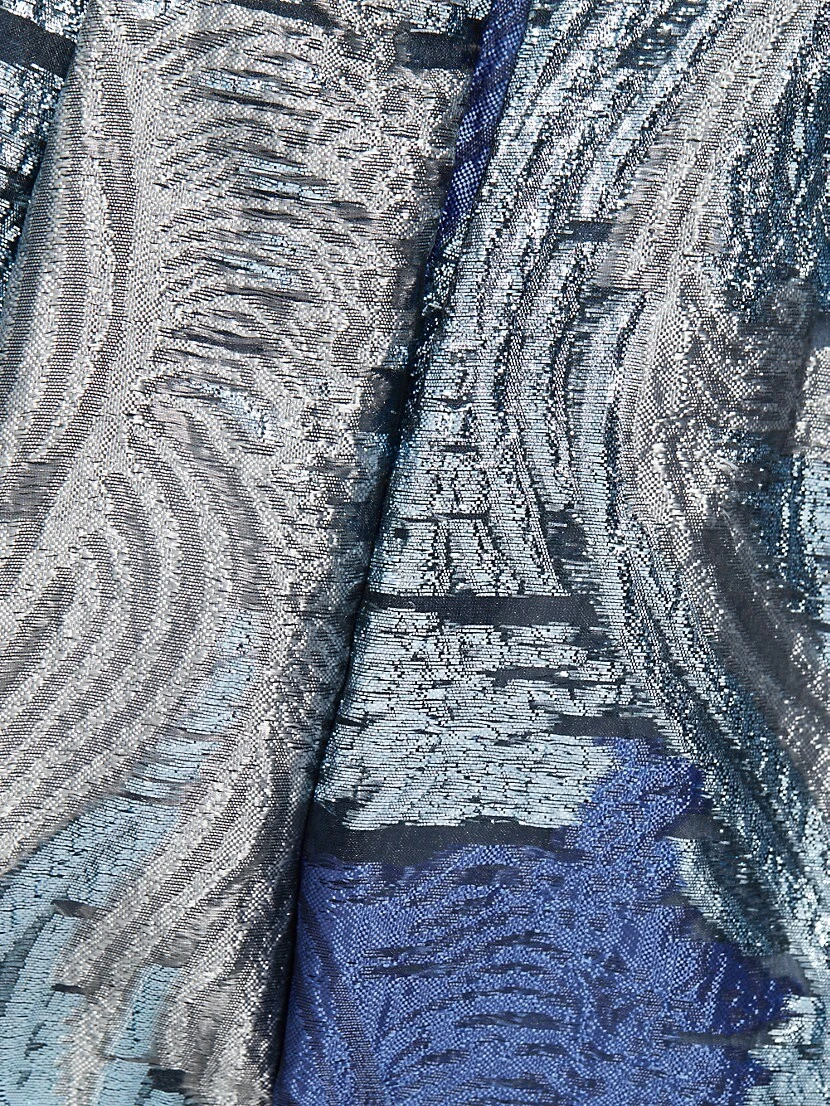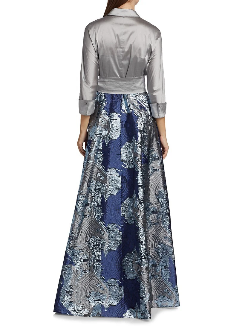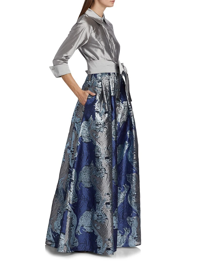 Teri Jon by Rickie Freeman’s shirtwaist gown flaunts a full skirt decorated with a metallic abstract jacquard motif. This elegant piece is finished with an oversized bow at the waist.