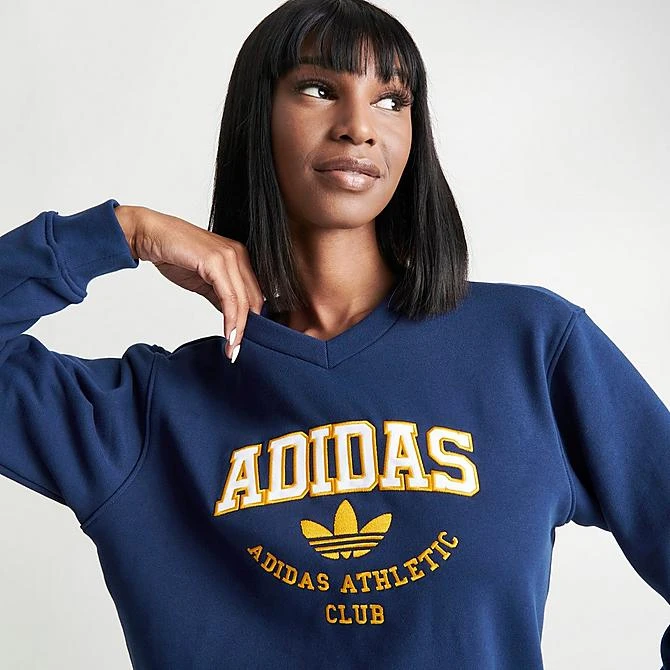 Those coveted college days can live on when you wear the Women’s adidas College Graphic V-Neck Sweatshirt. With a V-Neck composition and varsity vibes ingrained in the graphics, this sweatshirt is a nostalgic necessity to add to your cozy clothing collection.